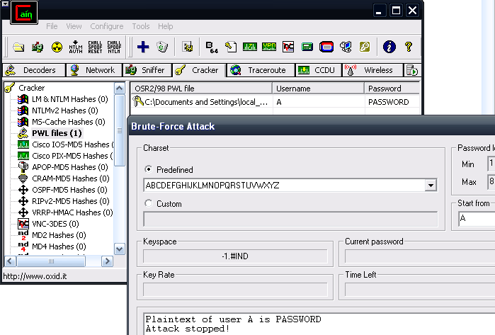 The first thing we can do when we have read access to the Windows directory through the share, is to locate all the *.pwl files on the c:\windows directory, copy them to your machine where Cain is installed, switch to Cracker tab, pwl files, load the pwl file, add username based on the filename, and try to crack it. If you can't crack it you might still try to add a .pwl file where you already know the password in the remote windows directory. Although this is a fun post-exploitation task, but still, no remote code execution. These passwords are useless without physical access.